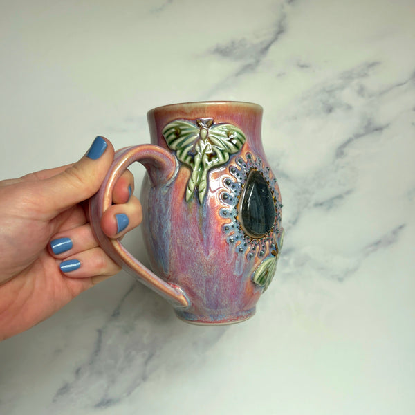 - This handmade mug features a beautiful blue green labradorite crystal embedded at its center.