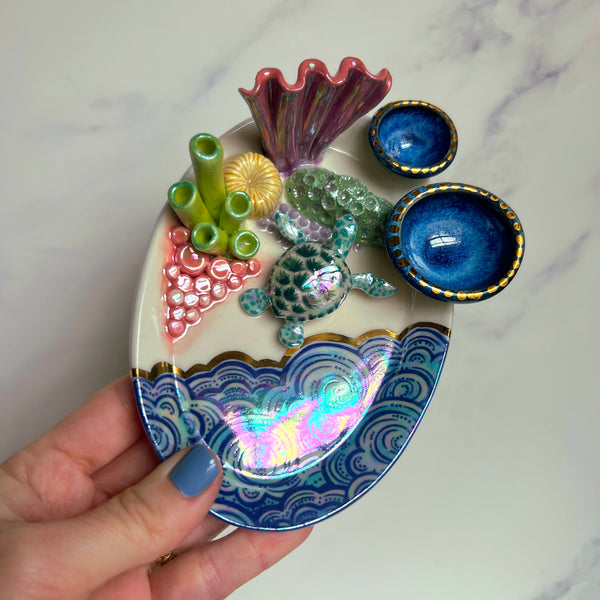 Oval Sea Turtle Coral Reef Dish with 2 Mini Bowls Iridescent Cloud Altar Ring Jewelry Tray C