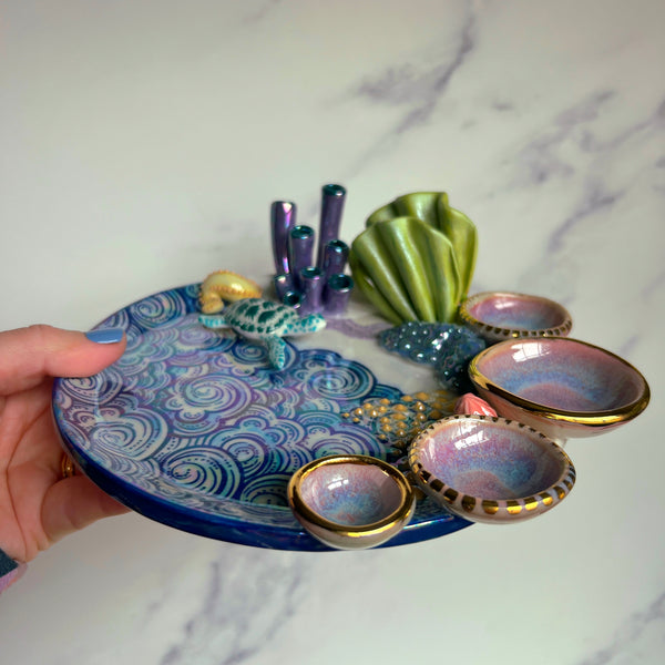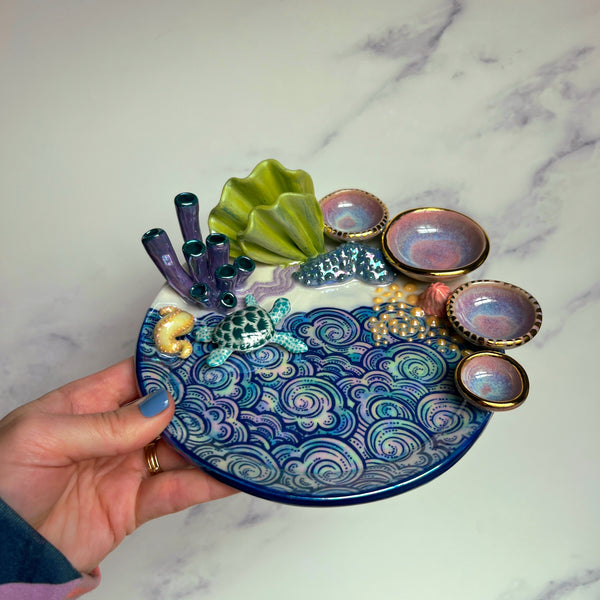Sea Turtle Coral Reef Dish with 4 Mini Bowls Iridescent Cloud Altar Ring Jewelry Tray A
