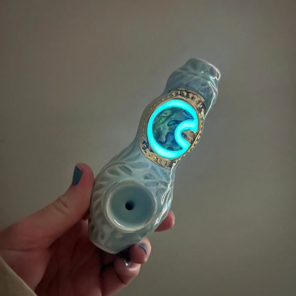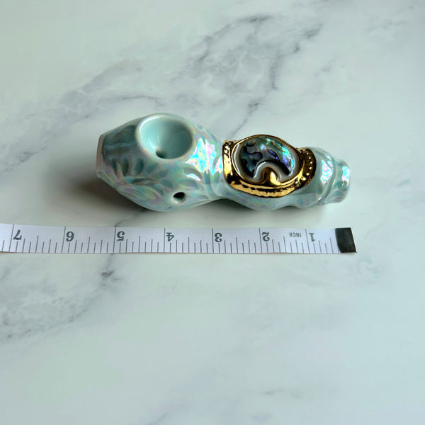 This unique porcelain ceramic pipe has a beautiful abalone shell at its center. It is a one of a kind, hand made custom pipe.