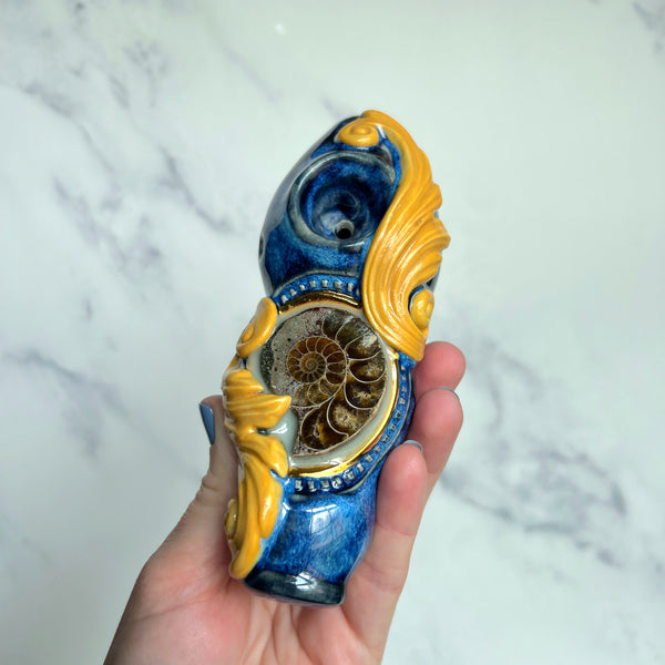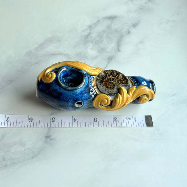 This unique porcelain ceramic pipe has a beautiful ammonite fossil crystal at its center. It is a one of a kind, hand made custom pipe.