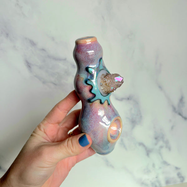 This unique porcelain ceramic pipe has a beautiful angel aura spirit quartz crystal at its center.  It is a one of a kind, hand made custom pipe.
