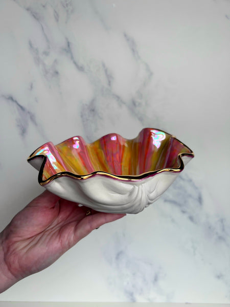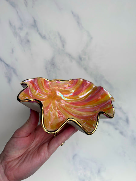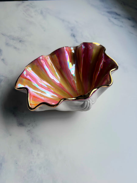 The shell is adorned with hand painted real gold luster and mother of pearl irridescent luster.
