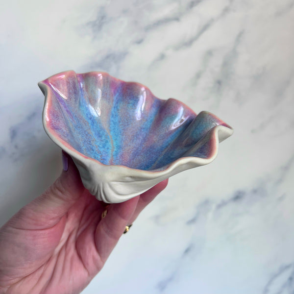 This cute little pink blue clam shell dish is perfect for holding rings or a cute soap dish.