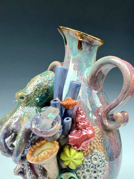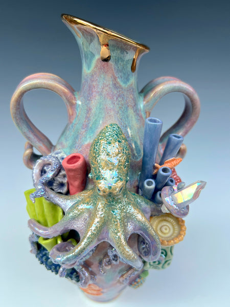 - This unique vase features a hand sculpted and painted Octopus with real gold detailing. Every detail of the reef was hand sculpted.
