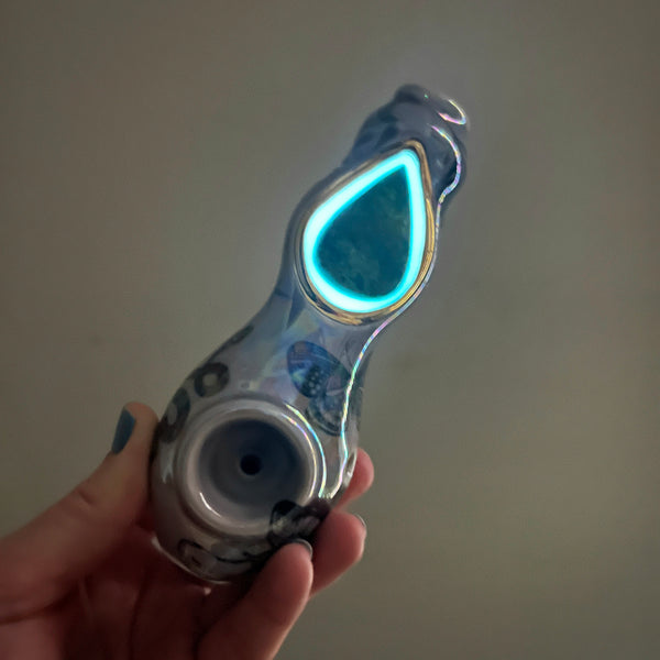 This unique porcelain ceramic pipe has a beautiful chrysocolla crystal at its center. It is a one of a kind, hand made custom pipe.