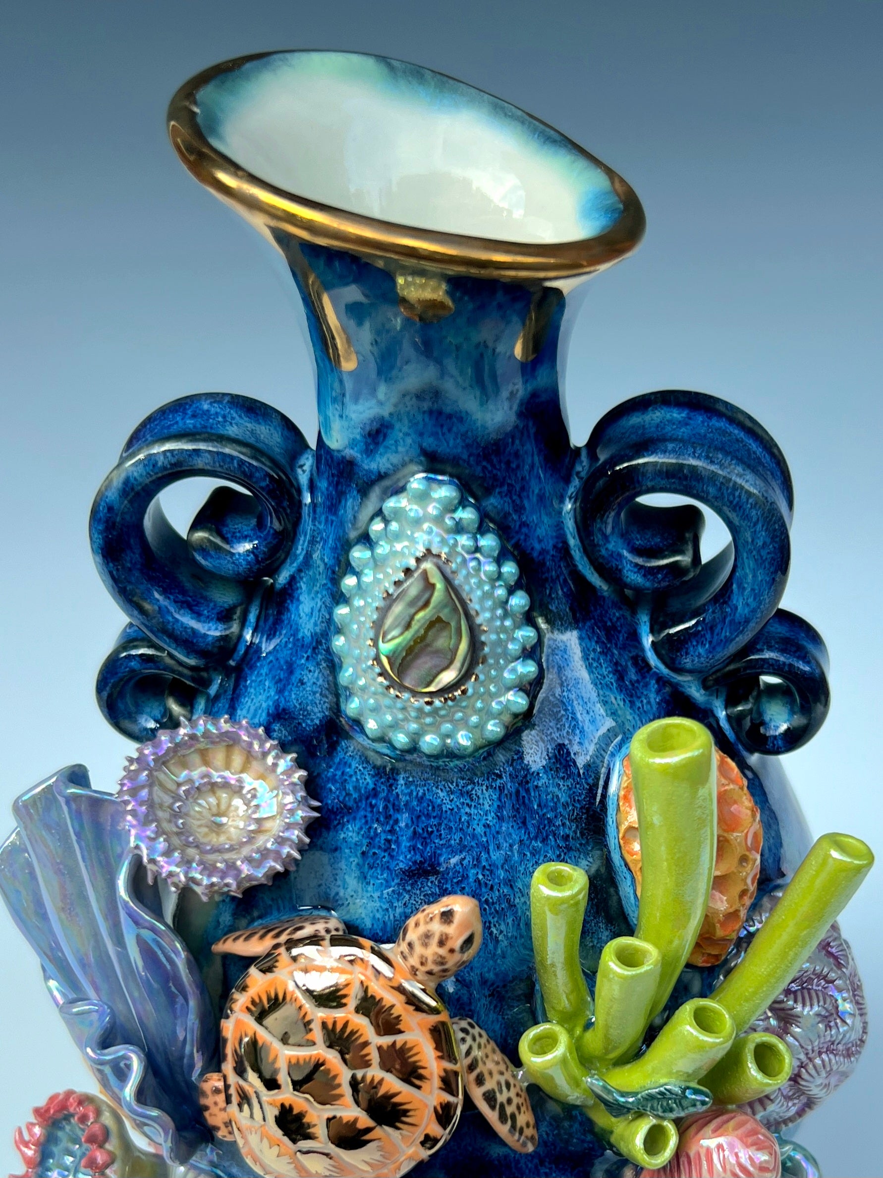 - This unique vase features a hand sculpted and painted sea turtle with real gold detailing. Every detail of the reef was hand sculpted.
