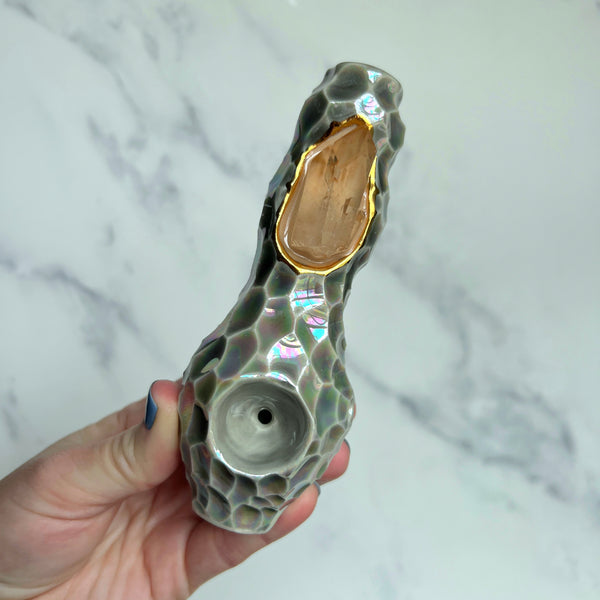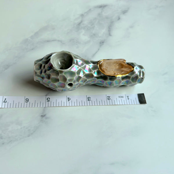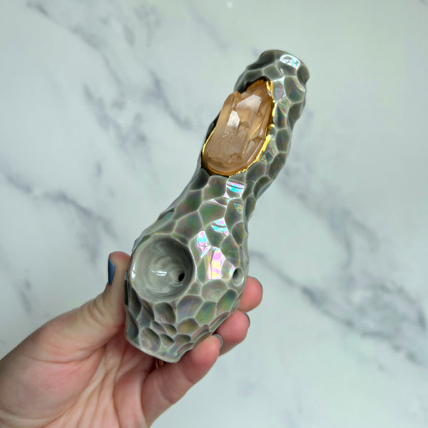 This unique porcelain ceramic pipe has a beautiful tangerine Quartz crystal at its center. It is a one of a kind, hand made custom pipe.