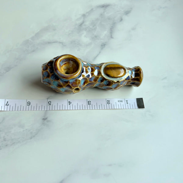 - Magnificent tigers eye is securely embedded in this ceramic pipe.